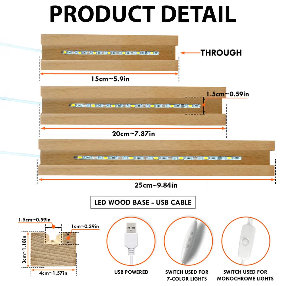 • Lieferumfang: 1 Acrylplatte + 1 Holzsockel + 1 USB Typ A (Netzteil ist NICHT enthalten)
